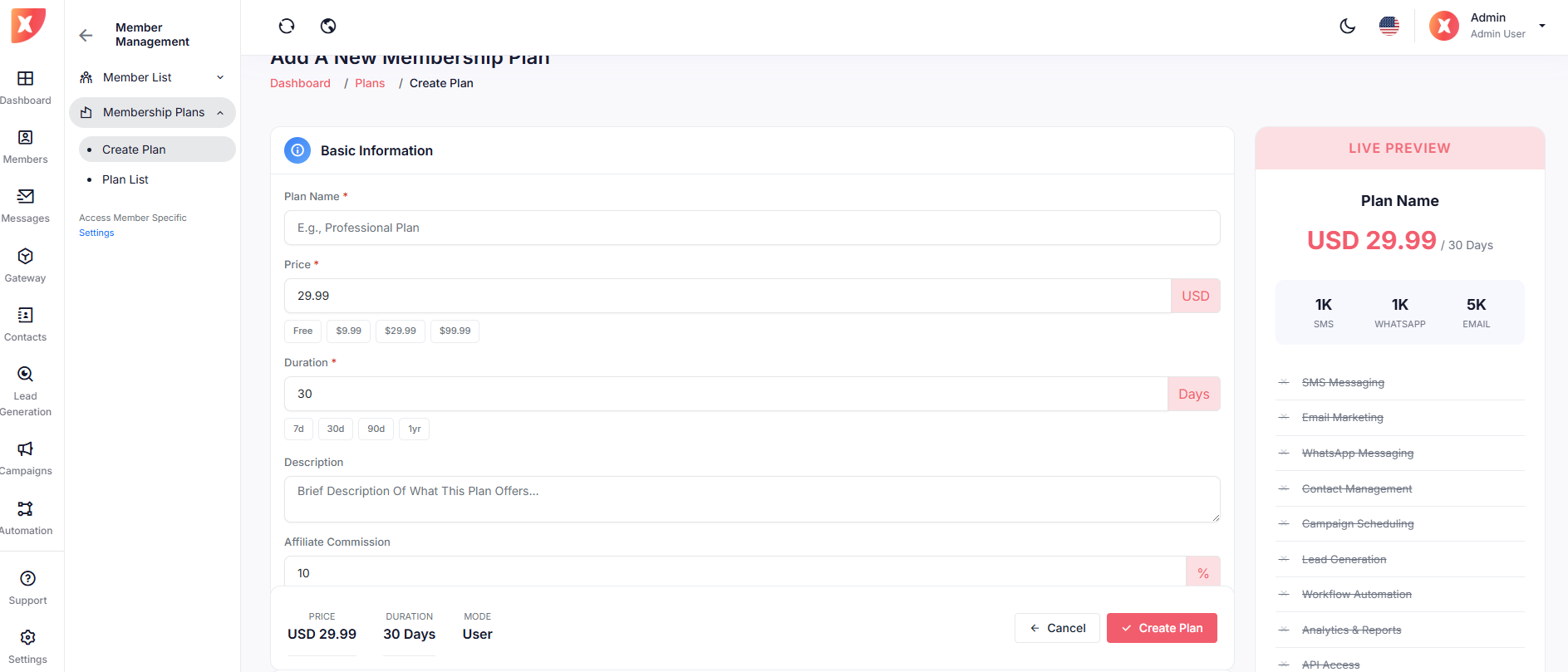 Admin Panel → Membership → Plans