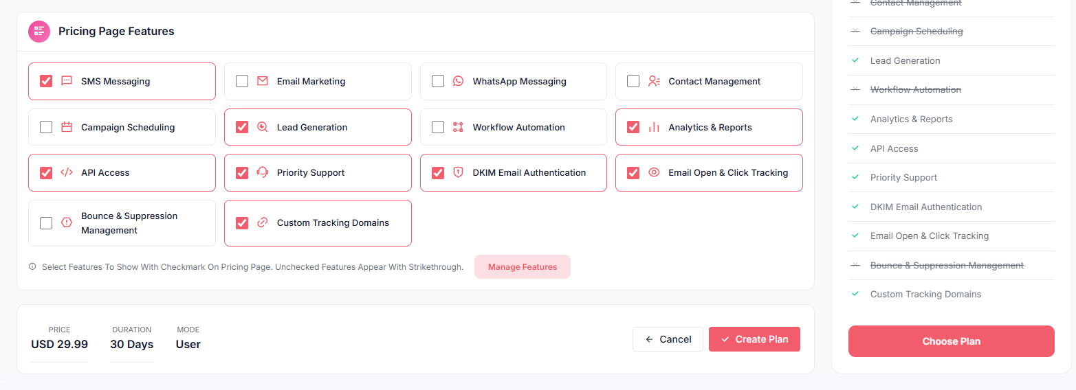 Easily customize which features are shown for each plan directly from the admin panel.