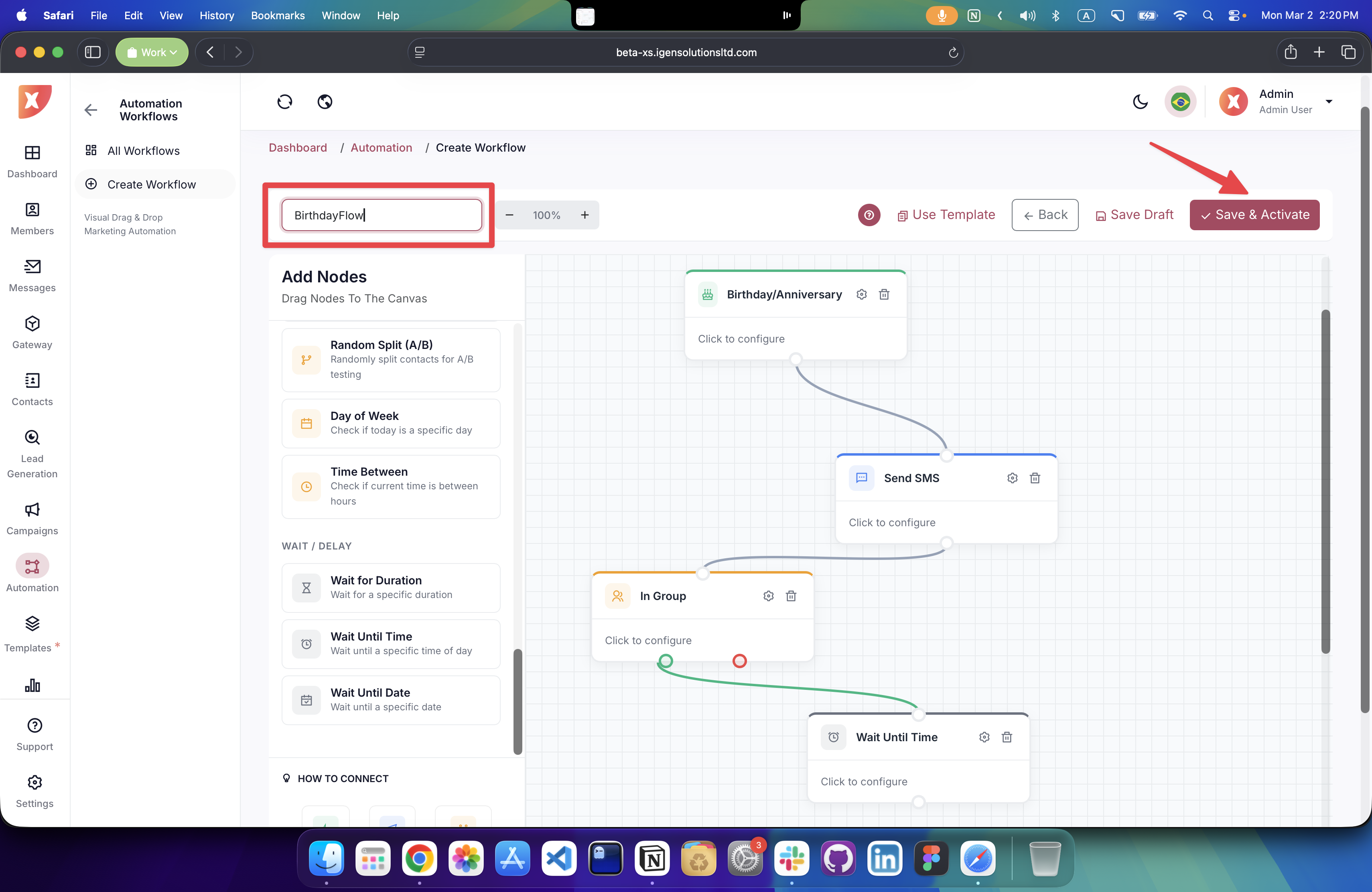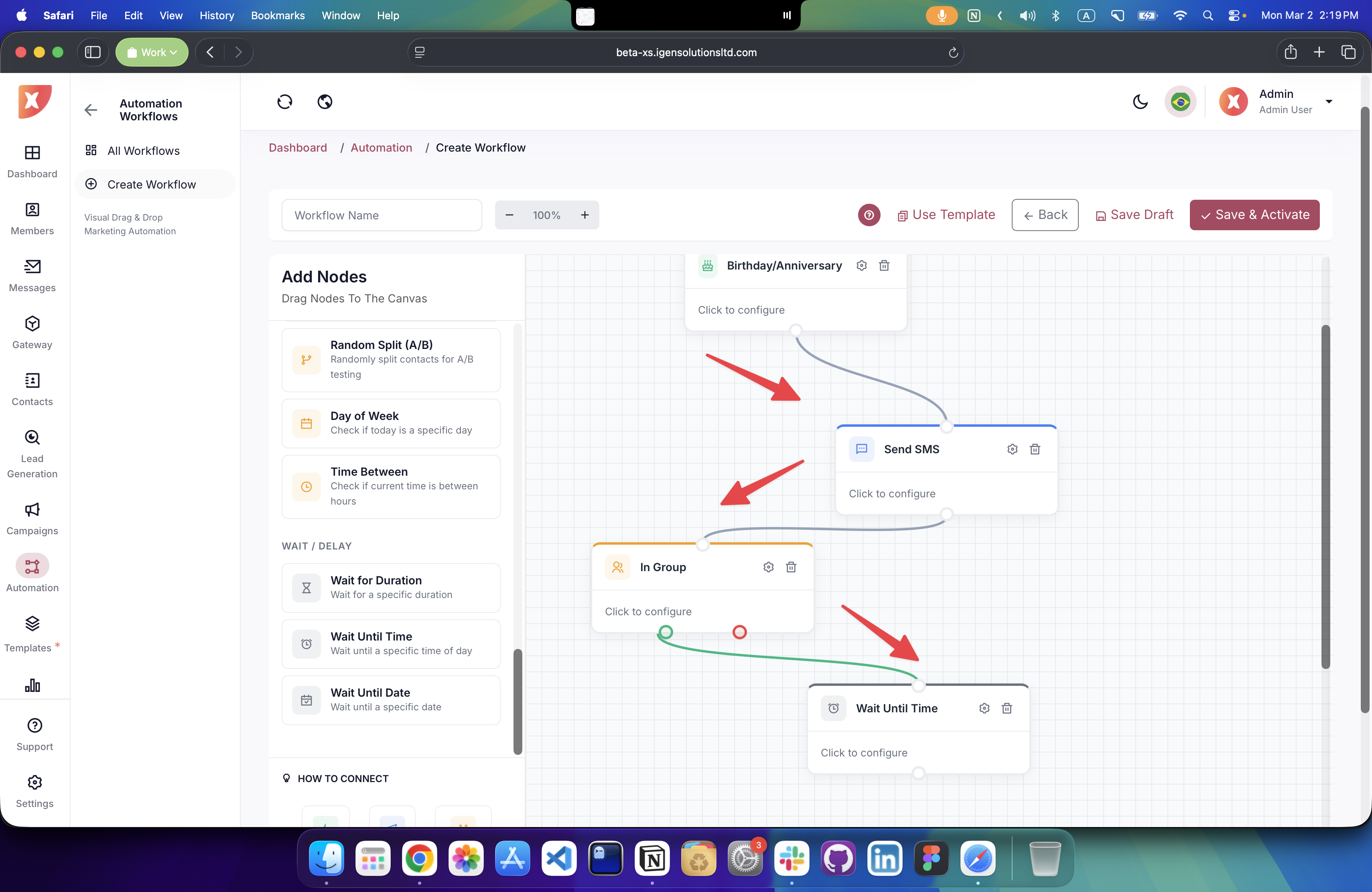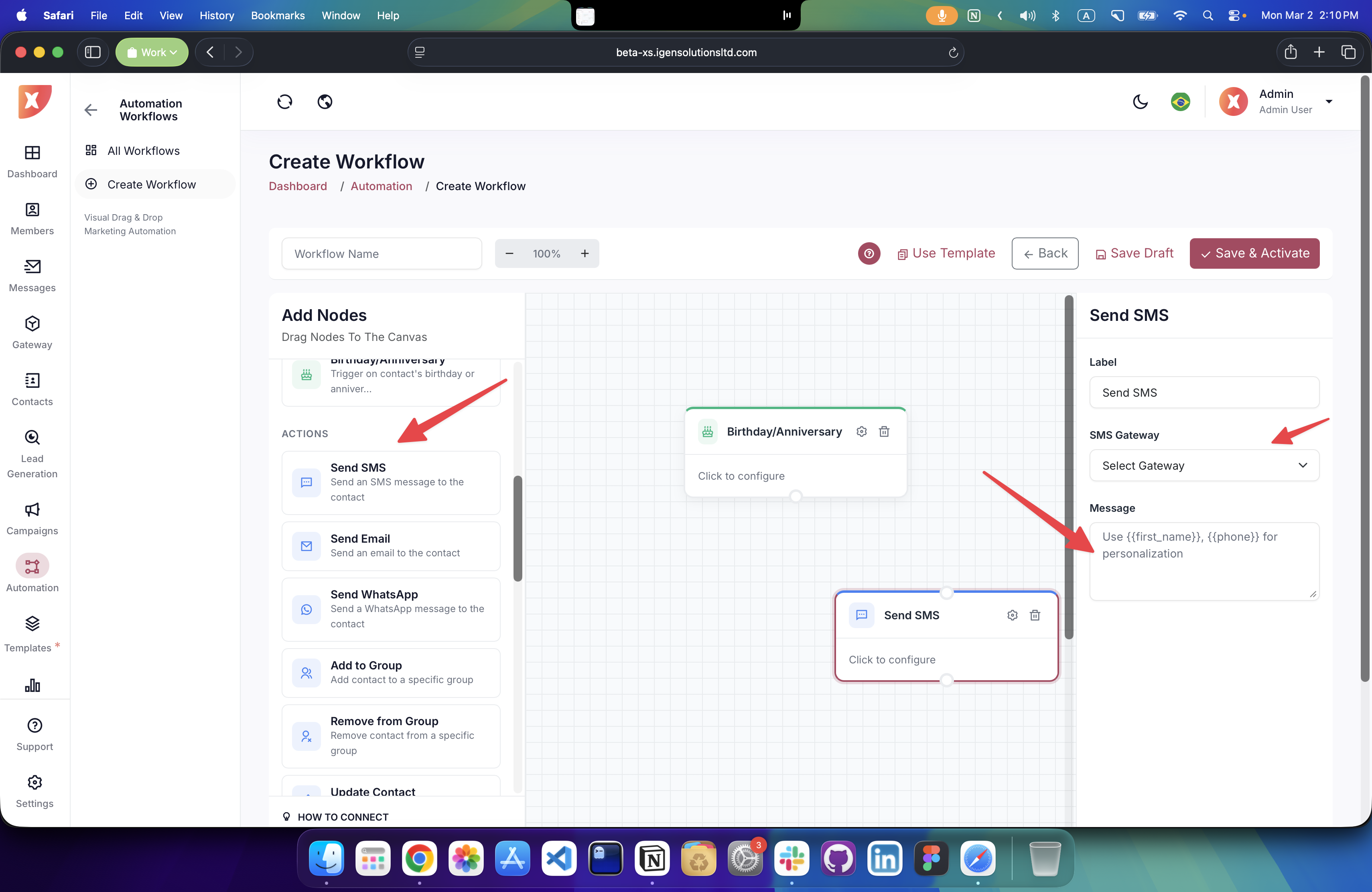 Next, scroll down to the Actions section. Click and drag the Send S M S node onto the screen