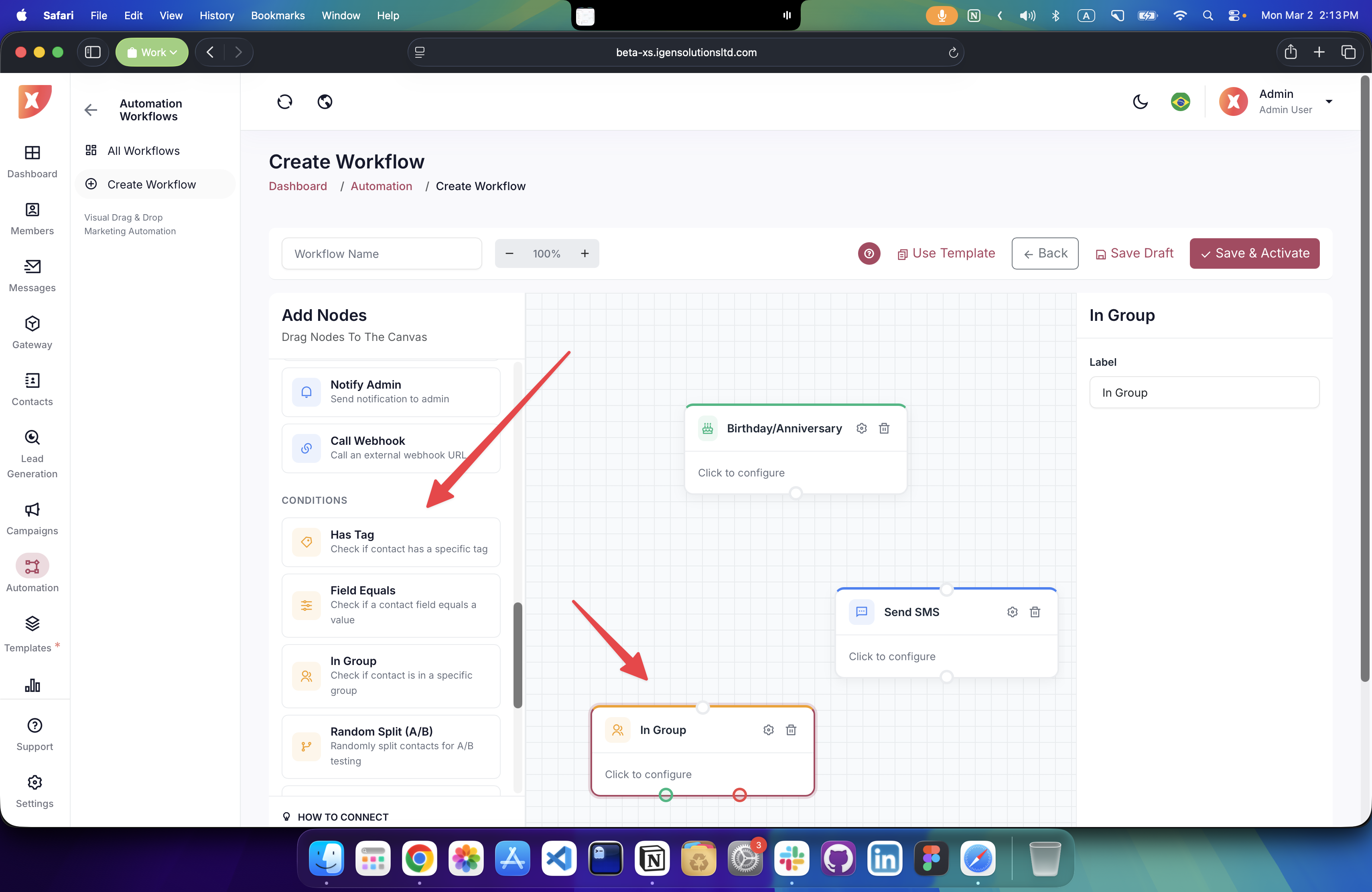 Now, let us add some logic to our sequence. Under Conditions, grab the In Group node and drag it over