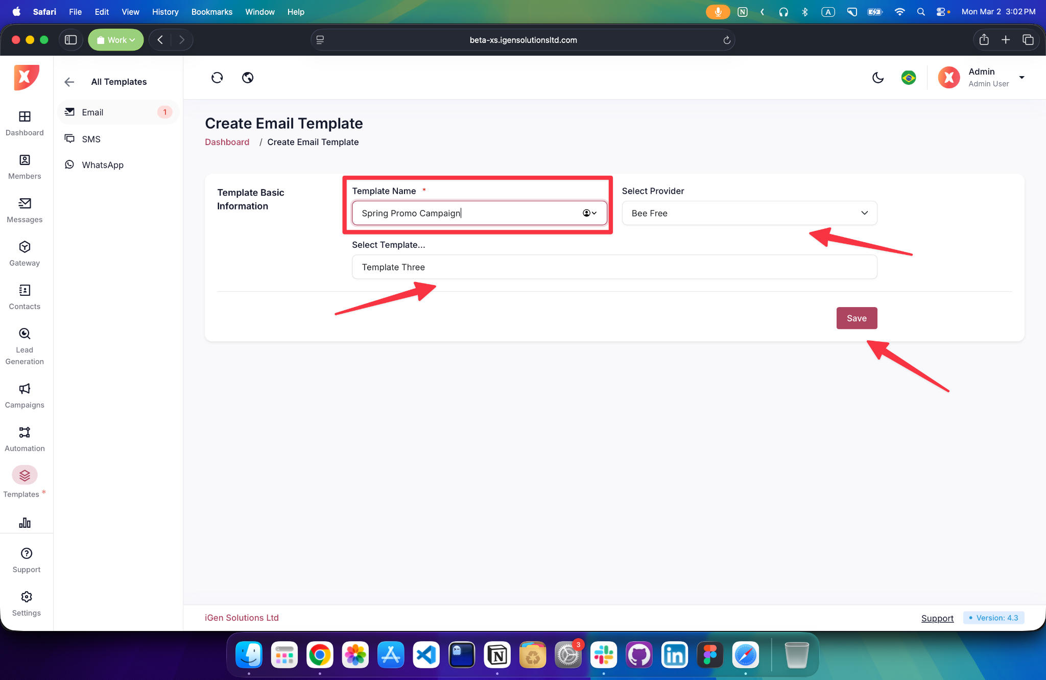 Enter a Template Name, select the Email Provider, and choose an existing Template from the list. After filling in the required information, click Save to create and store the email template for future campaigns.