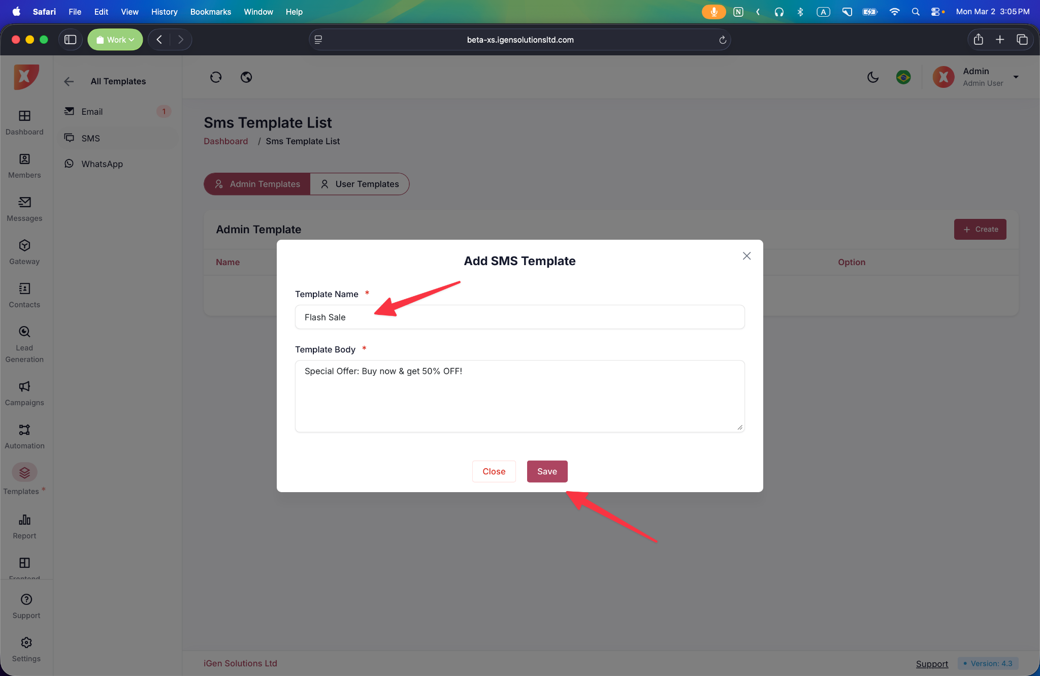 Enter a Template Name and write the SMS message content in the template body field. After completing the required information, click Save to create the SMS template or select Close to cancel.
