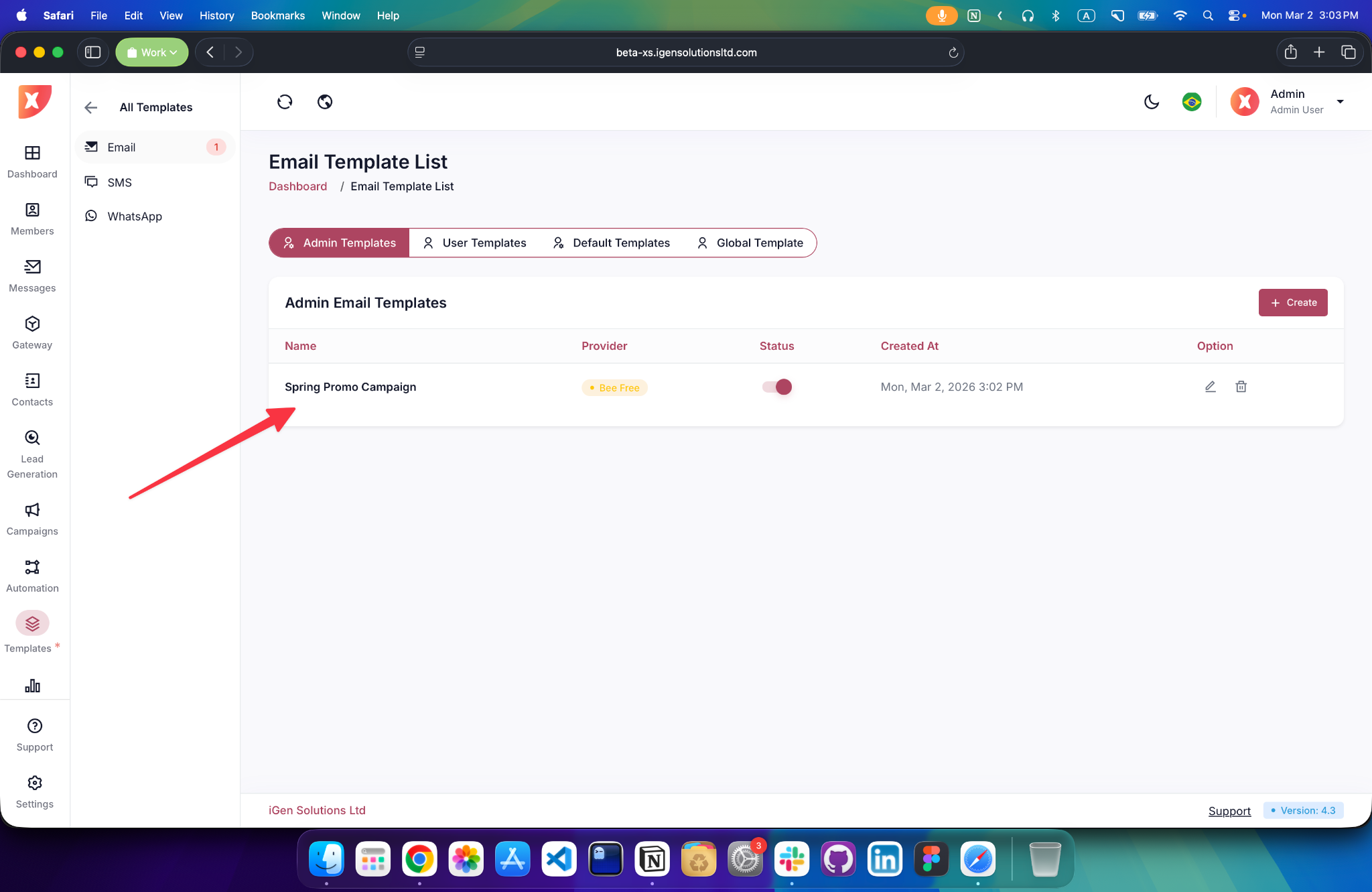 Use this page to view and manage all email templates. You can switch between Admin Templates, User Templates, Default Templates, and Global Templates using the tabs. From the list, you can check the template provider, status, and creation date, or use the action icons to edit or delete a template. Click Create to add a new email template.