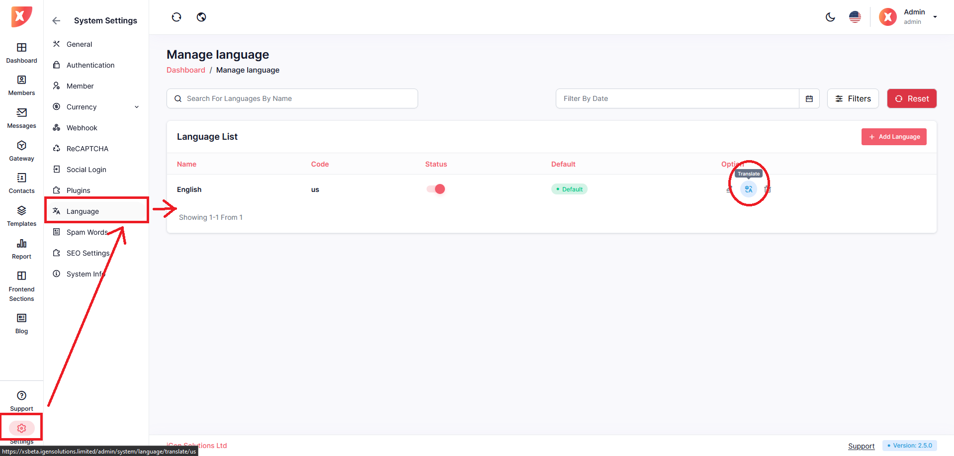 In Xsender we offer system-wide language support. To translate the website to your preferred language you have to set up the language first then translate the individual keys.
