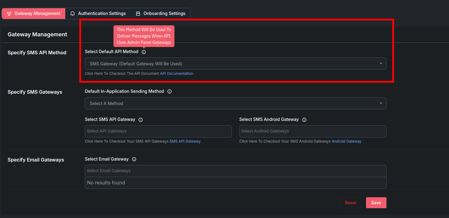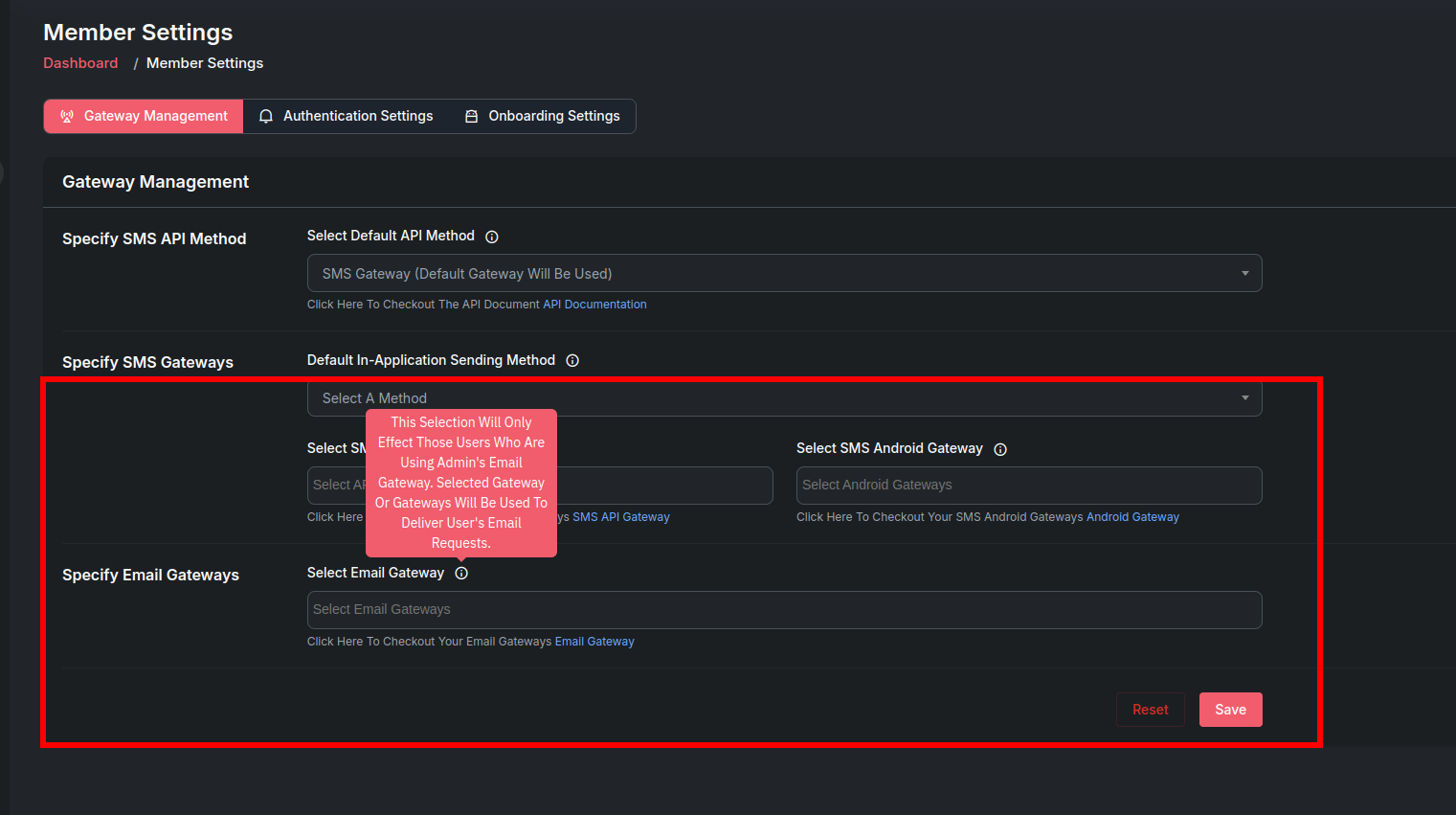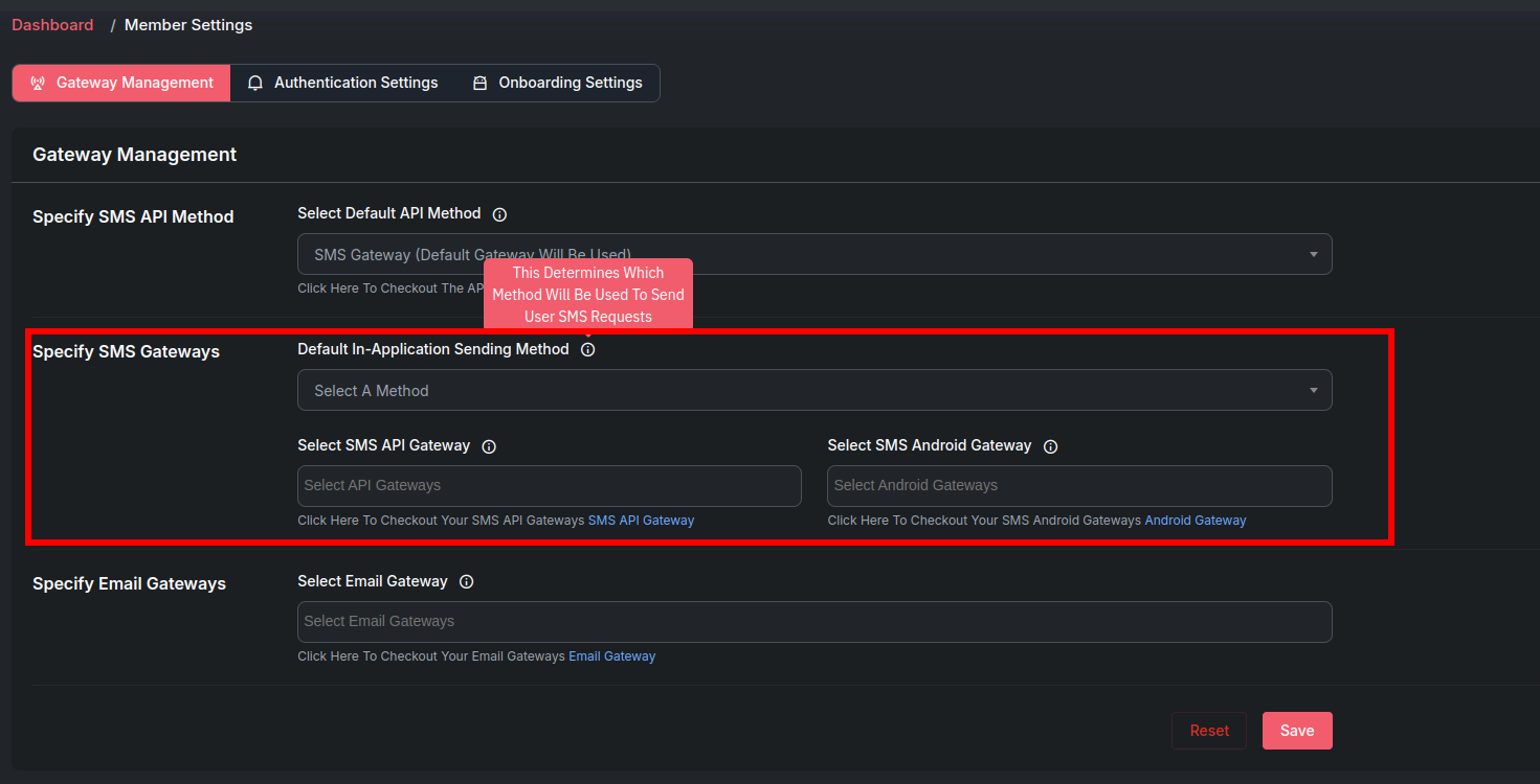The Gateway Management page under Member Settings enables administrators to specify default API methods and gateways for SMS and email communications within the application. It also provides options to select specific gateways for SMS, SMS Android, and email functionalities.