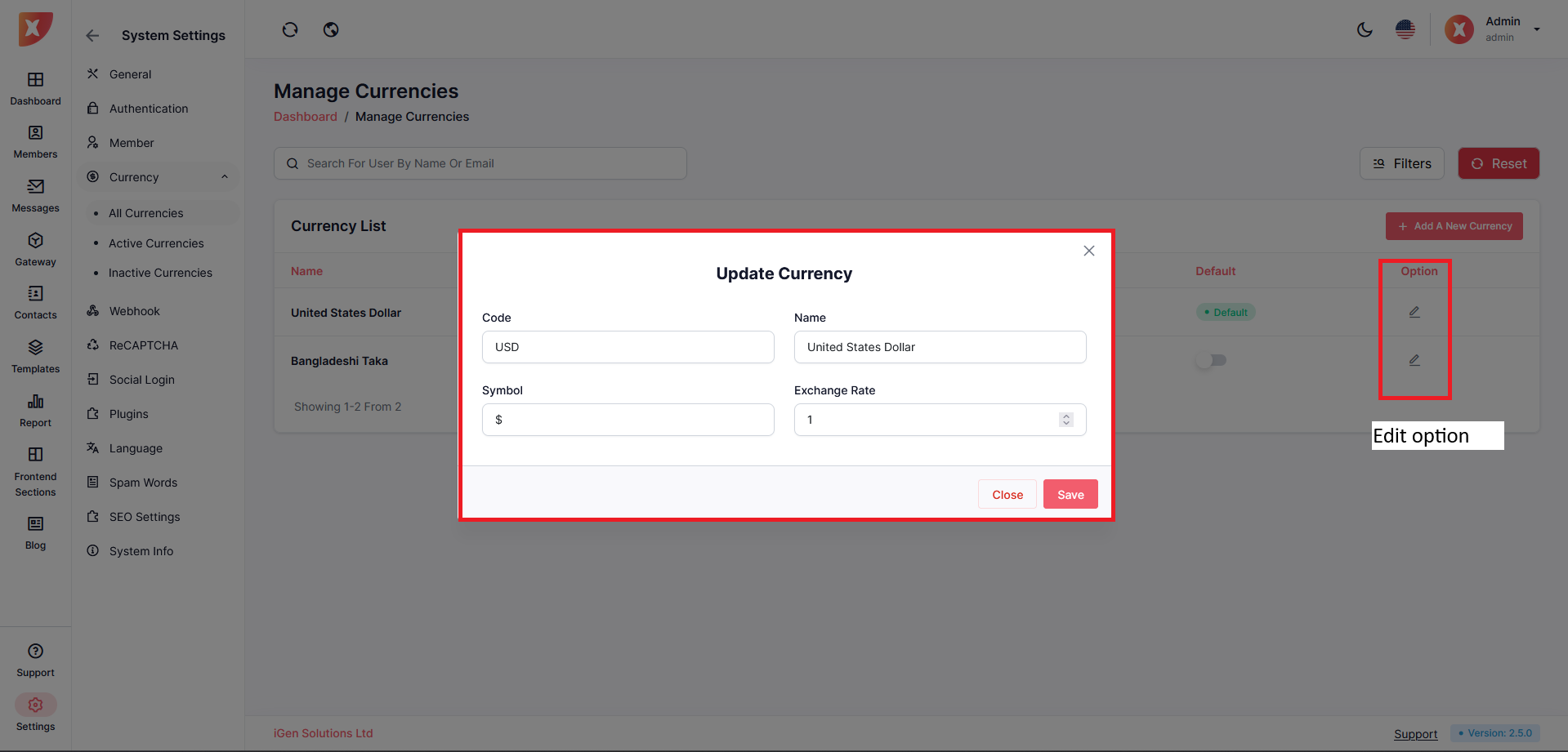 Edit added currency by clicking on the Edit icon under the option column