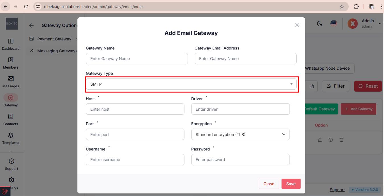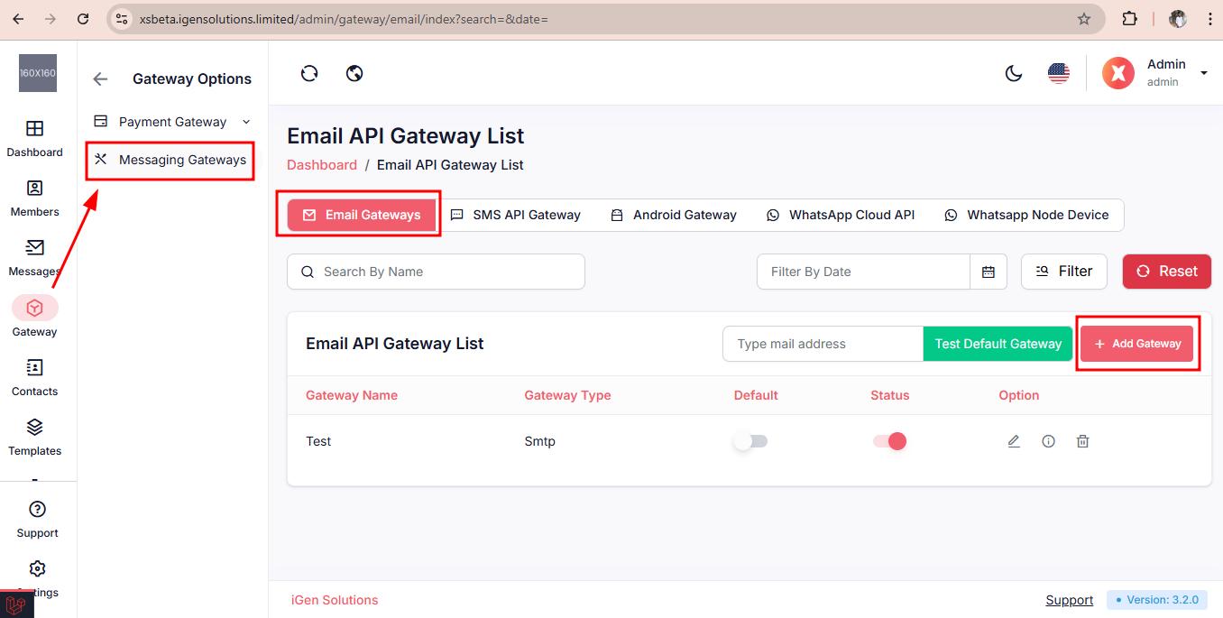 To set up your Email Gateway, navigate to Gateway > Messaging Gateways > click on the Email Gateways.