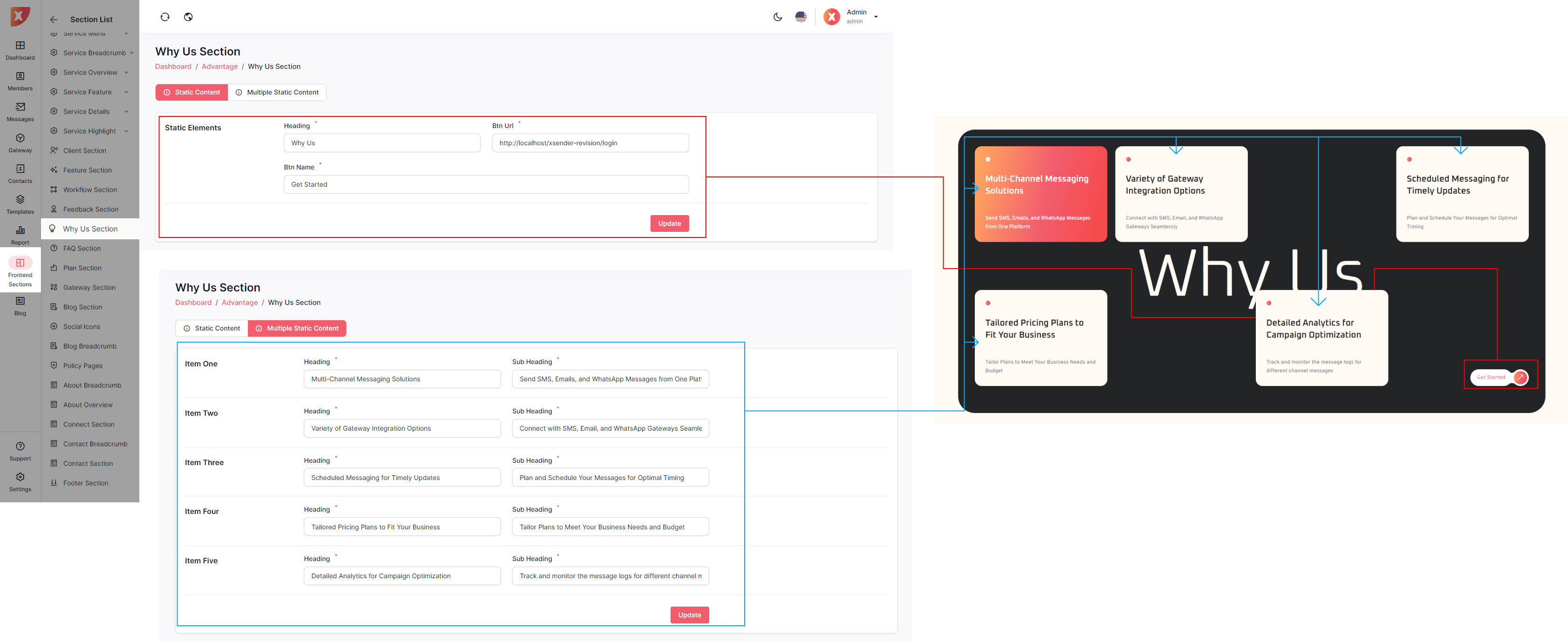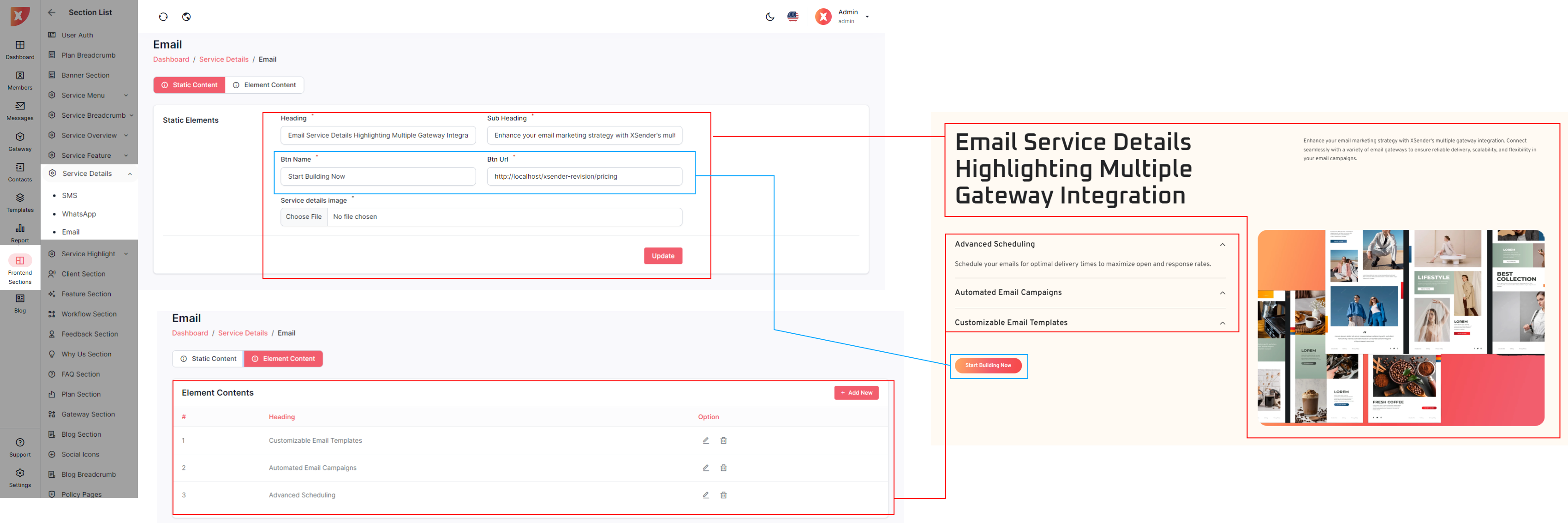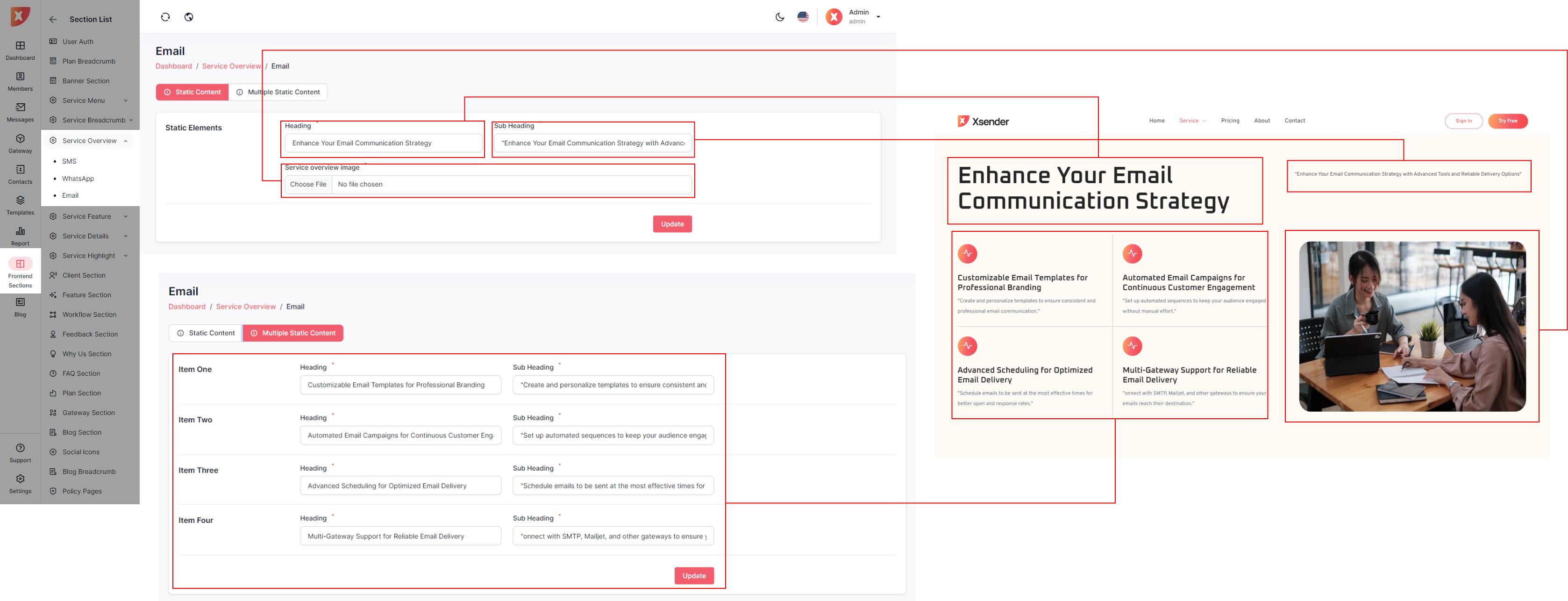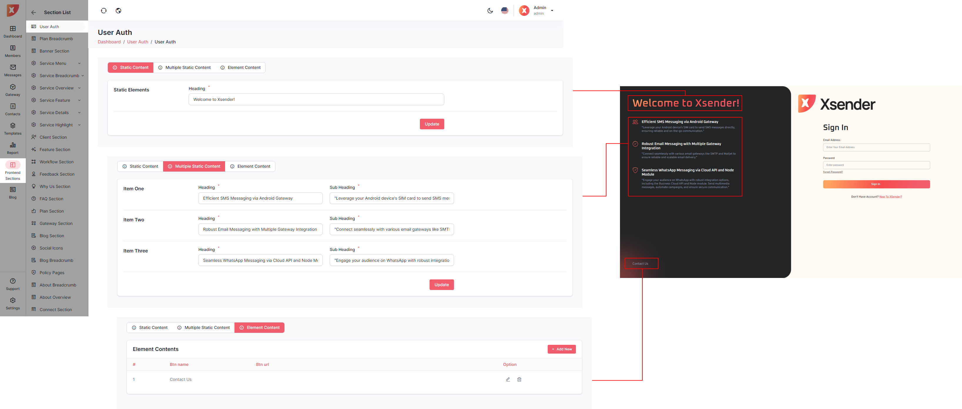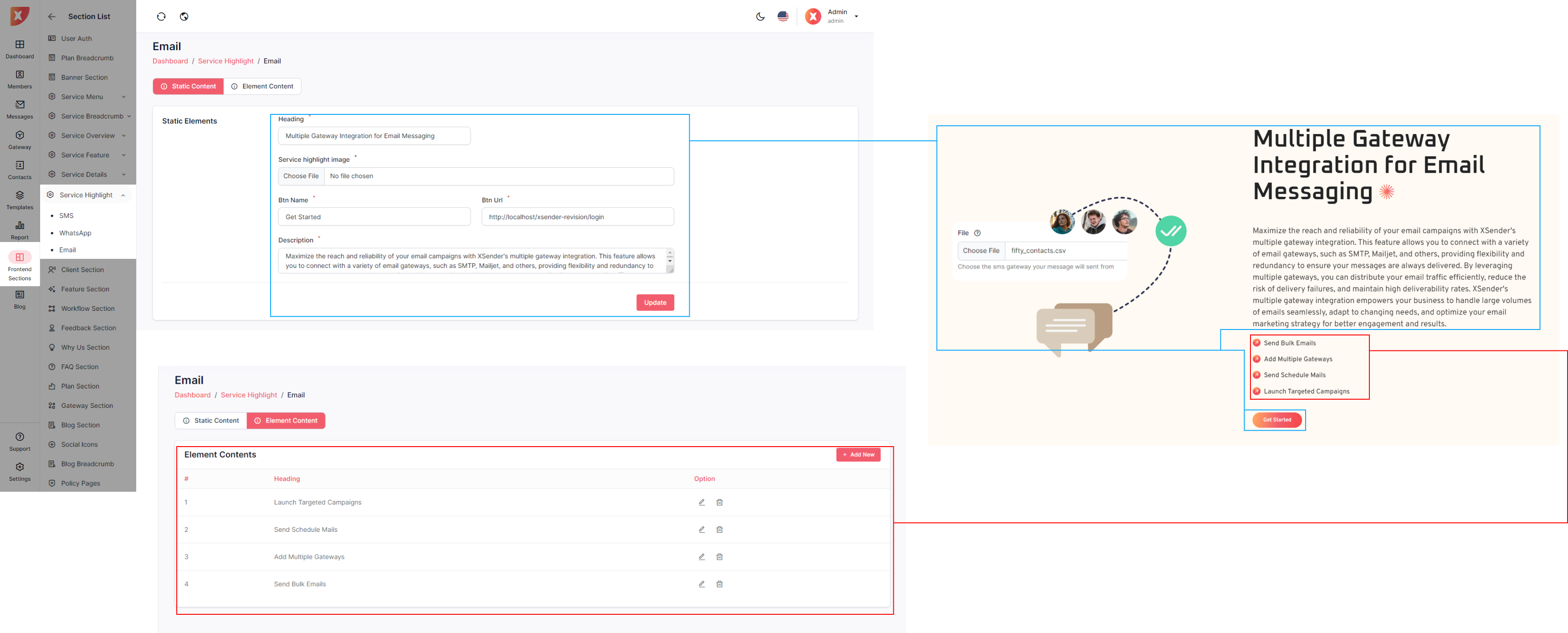 The admin panel in XSender allows administrators to easily customize elements of the landing page, providing full control over its appearance and content. Admins can update text, images, and layout configurations to align with branding needs and marketing strategies. This flexibility ensures the landing page can be tailored to attract and engage visitors effectively, enhancing the overall user experience.