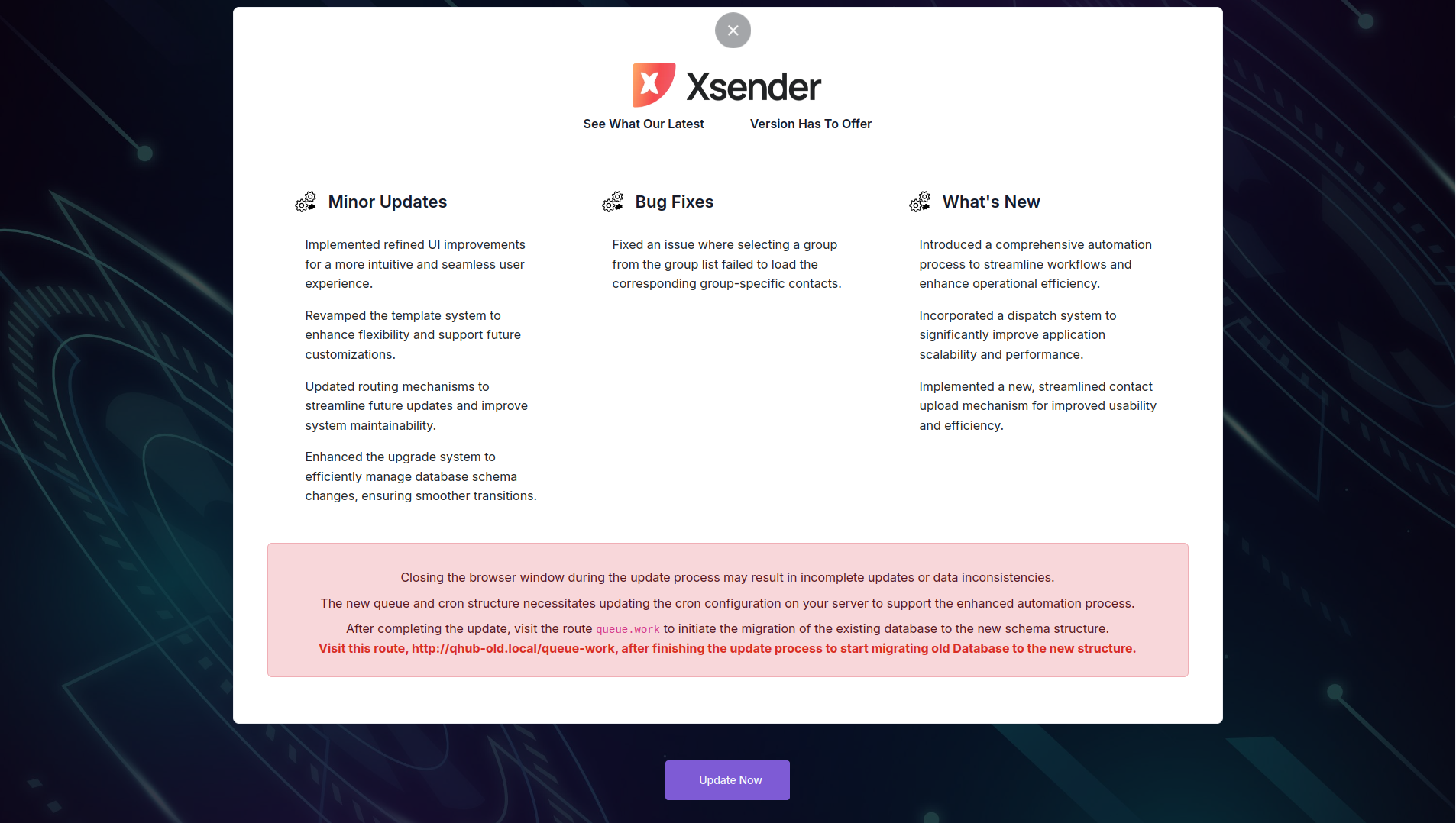 XSender web application's Update process is very simple and straight forward, just follow the instructions: