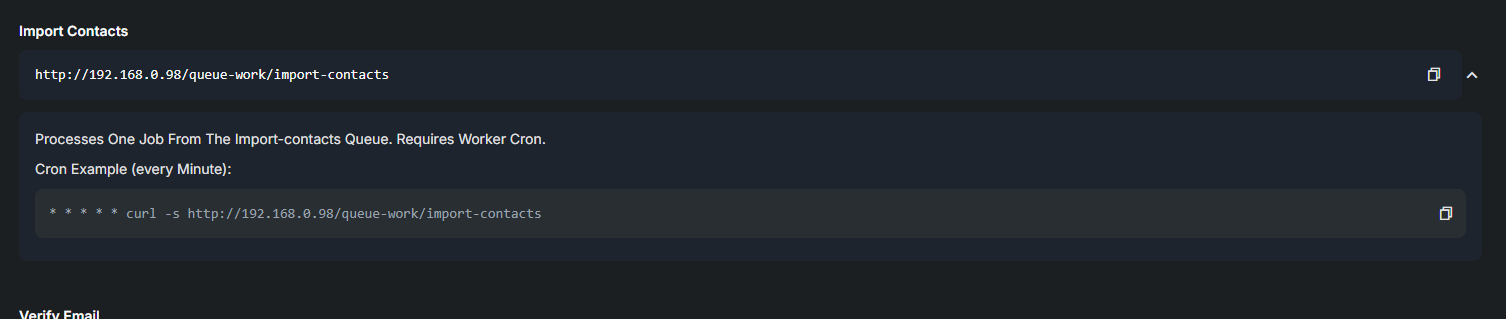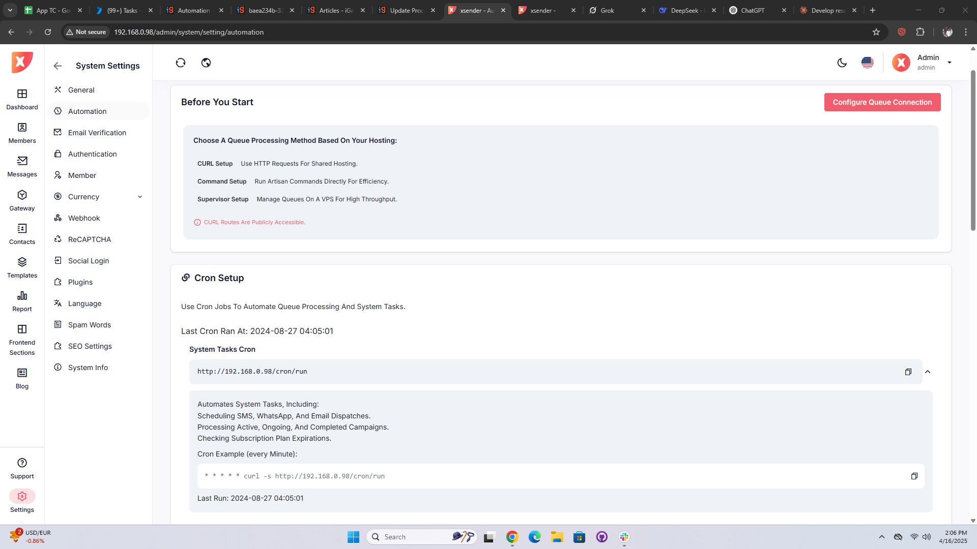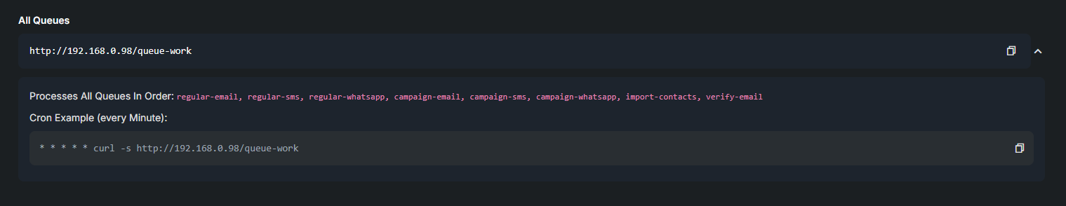The Automation Settings allows administrators to configure queue processing and automation tasks for the system. It supports three methods: CURL, Command, and Supervisor. These methods are used to trigger background jobs like importing contacts, verifying emails, and sending SMS or emails.