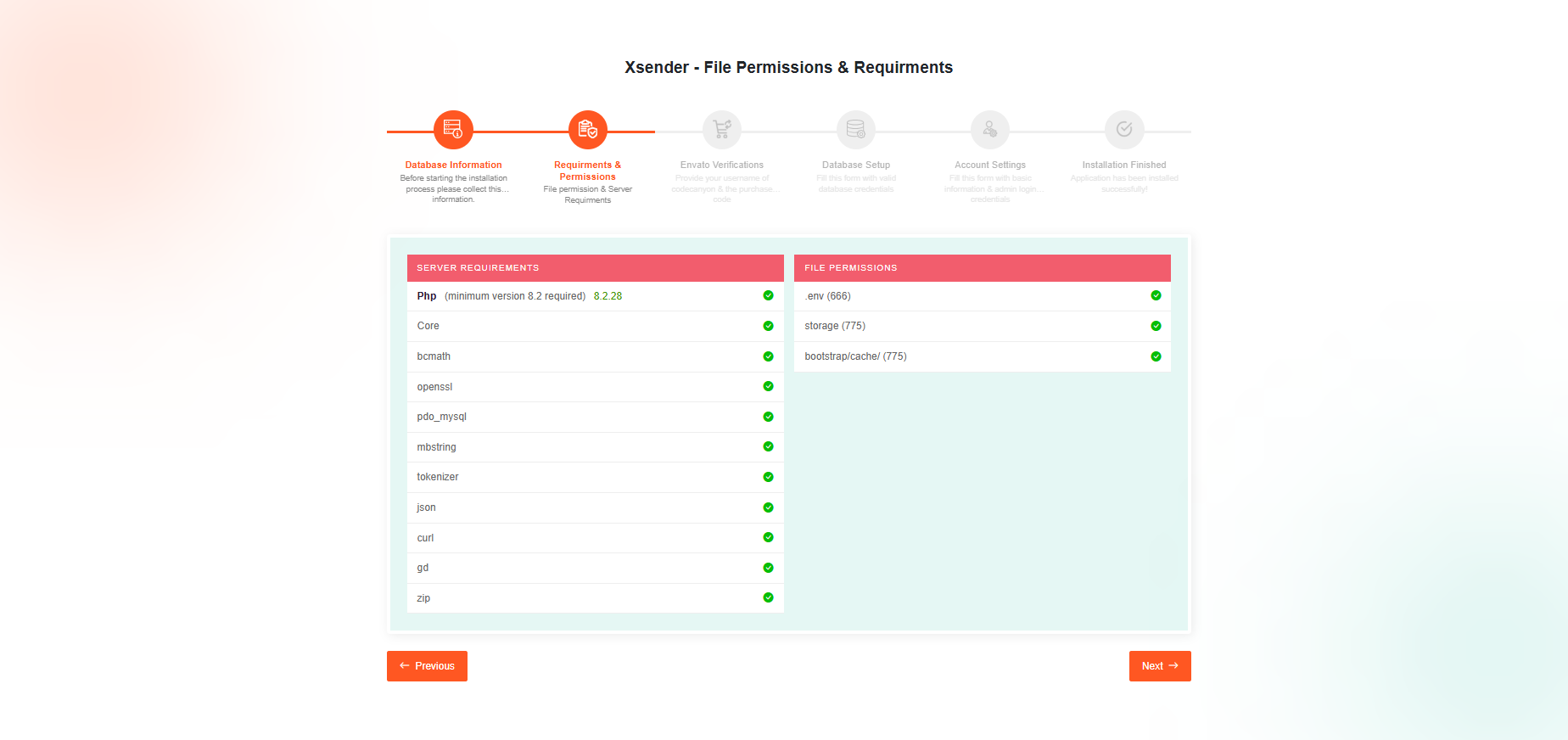 This step displays a checklist of server requirements and file permissions, e.g., PHP, env, storage, with green checkmarks indicating status