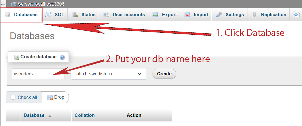 Create Database to MySQL server using phpMyAdmin. Then Go to browser and browse