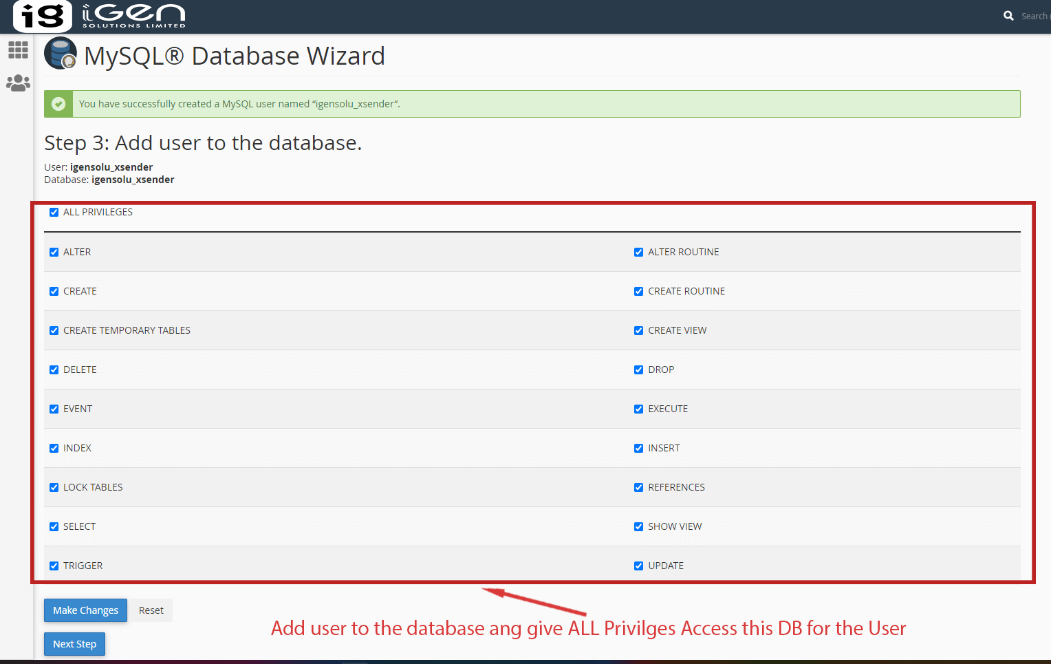 NB: Save to any notepaddatabase name, database username, database passwordfor next step.Now Add user to the database by checked ALL THE PRIVILEGES then Click Next Step