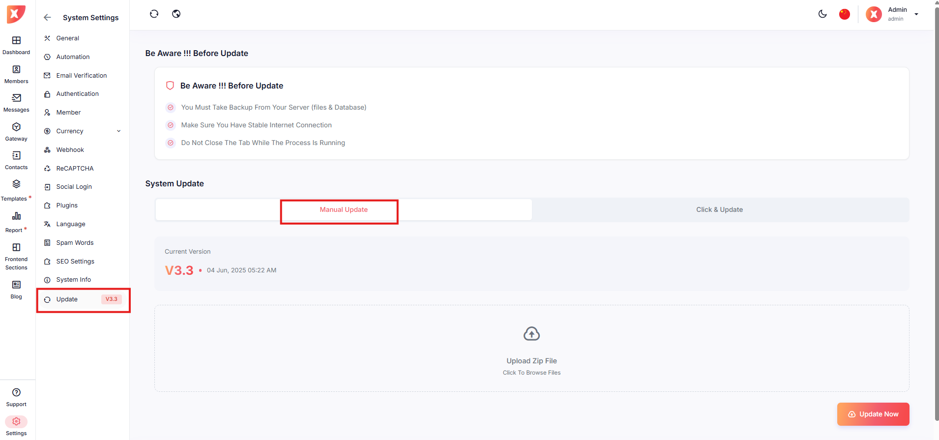 Upload a .zip file that contains the new version update files.